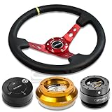 NRGSRK110HRG+200GM+101MB+006RDY, NRG Innovations 13.78" 350mm 3" Deep Dish Style Black Leather Yellow Center Marking Red Spokes Racing Steering Wheel Combo with 6 Hole Short Hub Adapter with Gen 2.0 Gun Metal Quick Release with Matte Black Lock Hub Kit SRK-110H